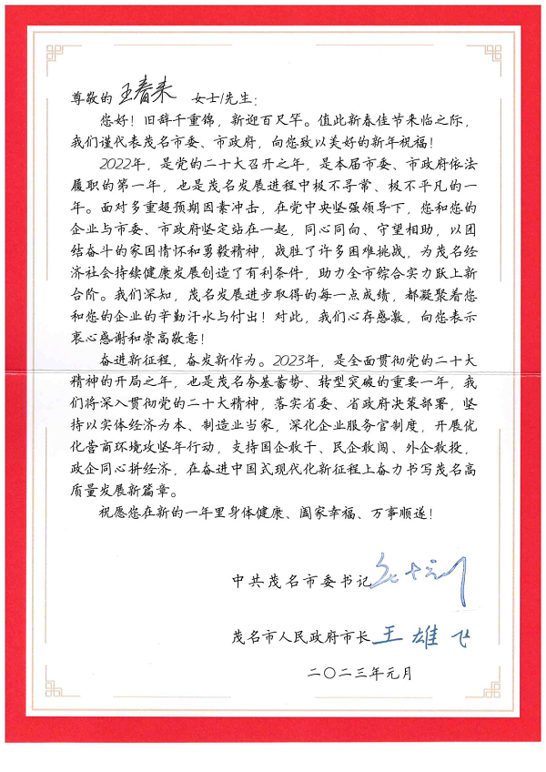 中國能源工程集團所屬中機茂名收到茂名市人民政府感謝信