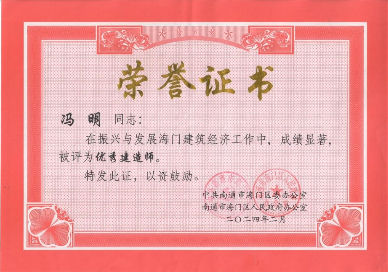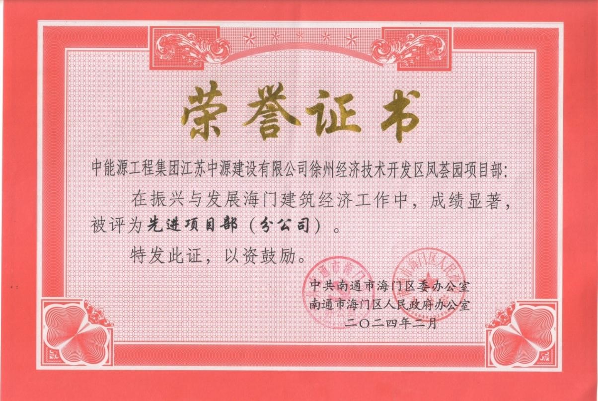 • 2024年2月20日,中國(guó)能源工程集團(tuán)所屬中能源工程集團(tuán)江蘇中源建設(shè)有限公司(以下簡(jiǎn)稱中源建設(shè))在2024年南通市海門區(qū)建筑業(yè)高質(zhì)量發(fā)展大會(huì)上受到中共南通市海門區(qū)委、區(qū)政府的隆重表彰。其中中源建設(shè)徐州經(jīng)濟(jì)技術(shù)開發(fā)區(qū)鳳薈園項(xiàng)目部被評(píng)為先進(jìn)項(xiàng)目部、郭勇同志和馮明同志被評(píng)為優(yōu)秀建造師、馬宇博同志被評(píng)為先進(jìn)個(gè)人。
